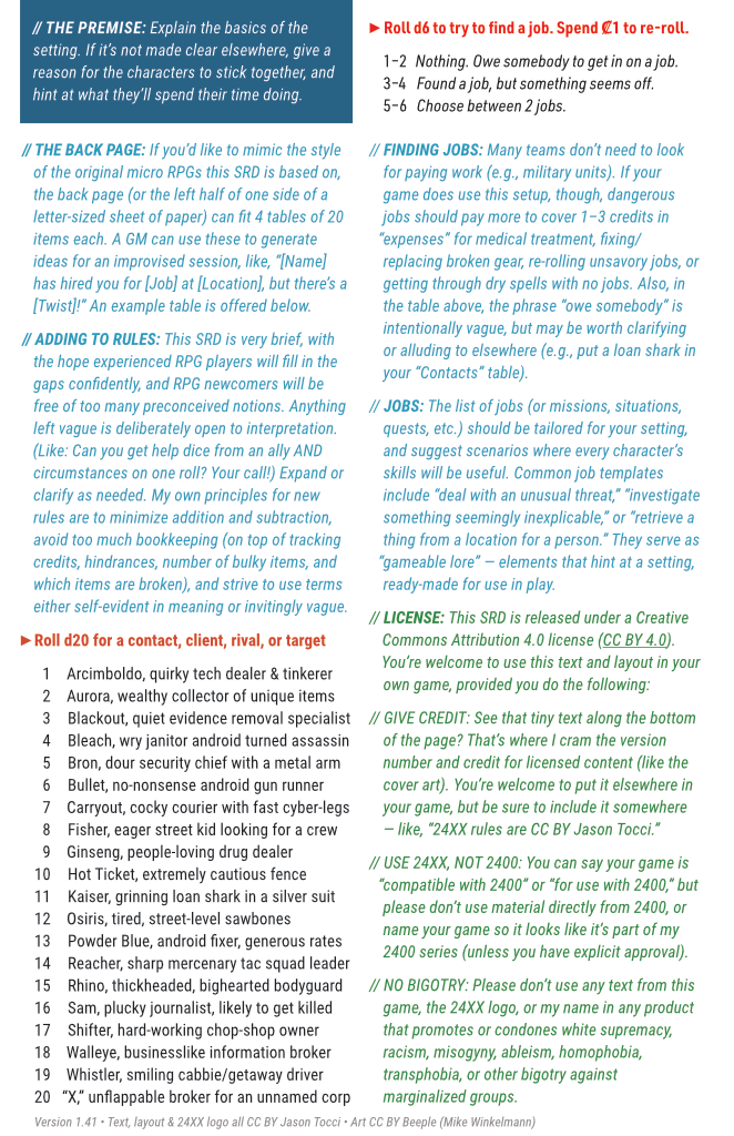 24XX is the free version of the rules used by the 2400 series of RPGs, released under a Creative Commons Attribution 4.0 license, with advice on how to adapt these files for your own game. Materials include: